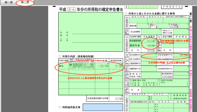 青色申告での源泉徴収や保険金額の記載方法 青色申告 2013年02月20日 【全国送料無料】2012年12月発売やよいの青色申告 13青色申告の時期がきました。今年初めての青色申告なので、経理なんて無理なんだけどなーと思いつつ、やよいの青色申告を購入しました。しかしわからない事がたくさんあり悪戦苦闘。その中でもつまづいたのが、保険の控除金額や源泉徴収表。会社にも勤めている為、源泉徴収表をもらったはいいもののどこへ記載していいのやら?給与貰っているのに記載しなくていいのかな?更には、生命保険料の控除、国民健康保険・国民年金の控除。ハガキはきているけどどこへどう入力していいのやら?などわからない事ばかり。なかなか情報が見つからずやっと入力方法にたどり着きました。という事で自分の来年の備忘録も兼ねて、やよい青色申告での記載方法を。まずは、やよいの青色申告を開き、決算・申告の「所得税確定申告書B」を開きます。「所得税確定申告書B」はグレーになって開けない場合があります。その際にはヘルプ→オンラインアップデートをすると開けるようになります。(自分も最初は開けませんでした・・・)所得税確定申告書Bを開いたら二表を開きます。そこの「所得の内訳(源泉徴収税額)」をクリックすると詳細が出てくるので、会社からもらった源泉徴収表を見ながら、所得の種類・住所・収入金額・源泉徴収税額を記入します。次に「所得から差し引かれる金額に関する事項」の⑫社会保険料控除⑭生命保険料控除それぞれに、国民健康保険料・国民年金・生命保険の金額を記載します。クリックで大きい画像が見られます。金額を記載して第一表を見るときちんとこちらにも反映されています。これで事業所得以外の給与所得、生命保険・健康保険・国民年金についても入力が完了しました。最初はどこを見ても有力な情報が得られなかったので、かなり苦戦致しました。しばらくは備忘録も兼ねて青色申告ネタが多くなりそうです。【送料無料】個人事業の青色申告と経理第2版 [ 深野章 ]